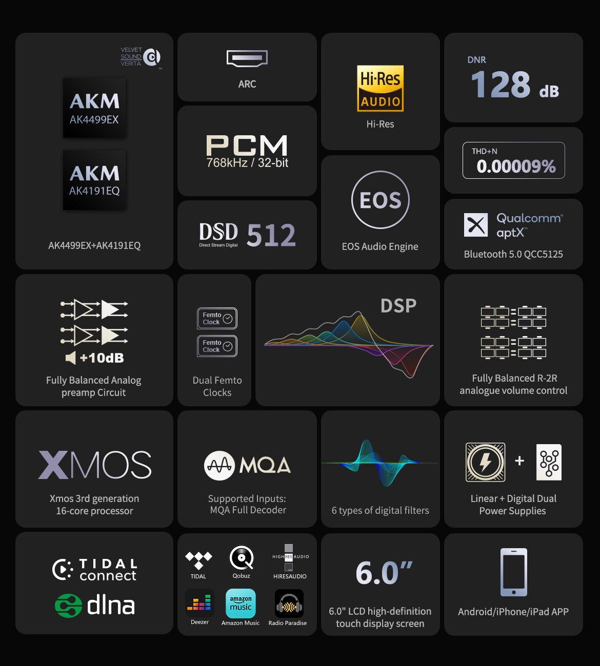 使用 AKM 旭化成旗艦品牌 Velvet Sound I Verita 頂級晶片 AK4499EX + AK4191EQ,實現最高境界數碼 / 模擬訊號獨立處理,將噪聲控制及動態范圍提升至極緻水平。