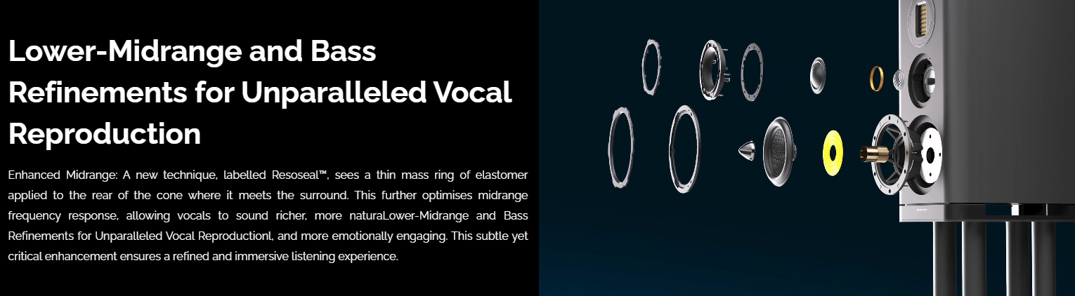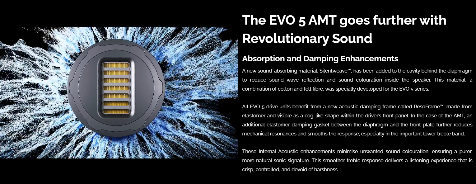 單元方面,使用比上一代面積更大的AMD高音單元,半球體中音(饅頭中音)亦重新設計,頻率響應更加線性順滑。