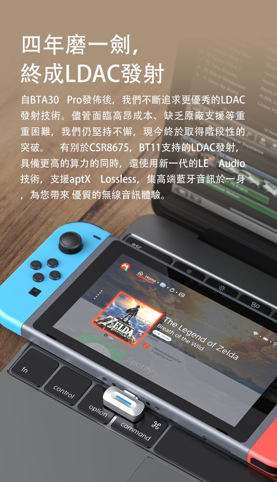 自BTA30 Pro發佈後,我們不斷追求更優秀的LDAC發射技術。儘管面臨高昂成本、缺乏原廠支援等重重困難,我們仍堅持不懈,現今終於取得階段性的突破。 有別於CSR8675,BT11支持的LDAC發射,具備更高的算力的同時,還使用新一代的LE Audio技術,支援aptX Lossless,集高端藍牙音訊於一身,為您帶來 優質的無線音訊體驗。