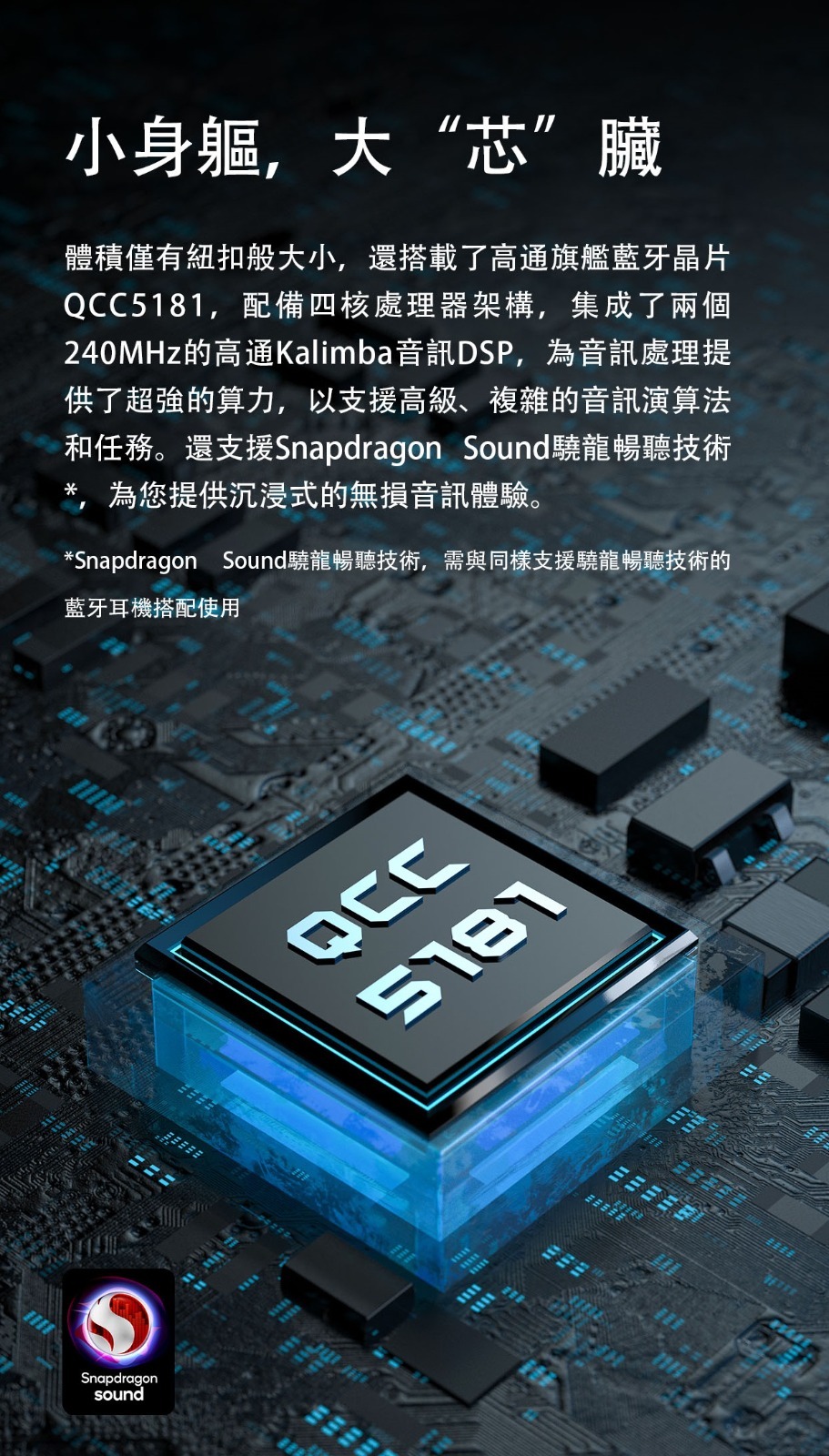 體積僅有紐扣般大小,還搭載了高通旗艦藍牙晶片QCC5181,配備四核處理器架構,集成了兩個240MHz的高通Kalimba音訊DSP,為音訊處理提供了超強的算力,以支援高級、複雜的音訊演算法和任務。還支援Snapdragon Sound驍龍暢聽技術*,為您提供沉浸式的無損音訊體驗。