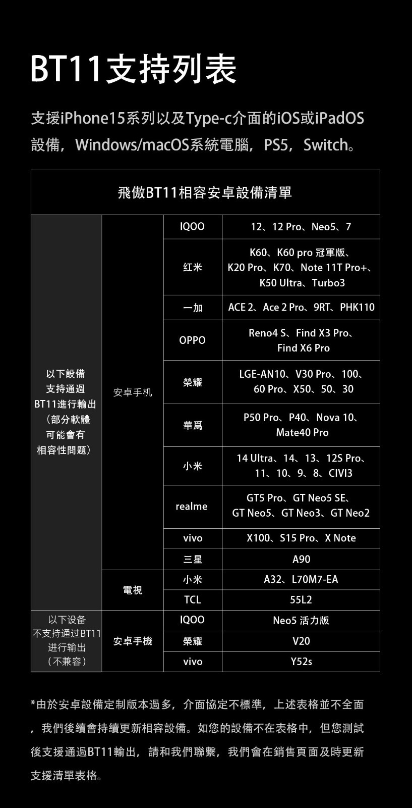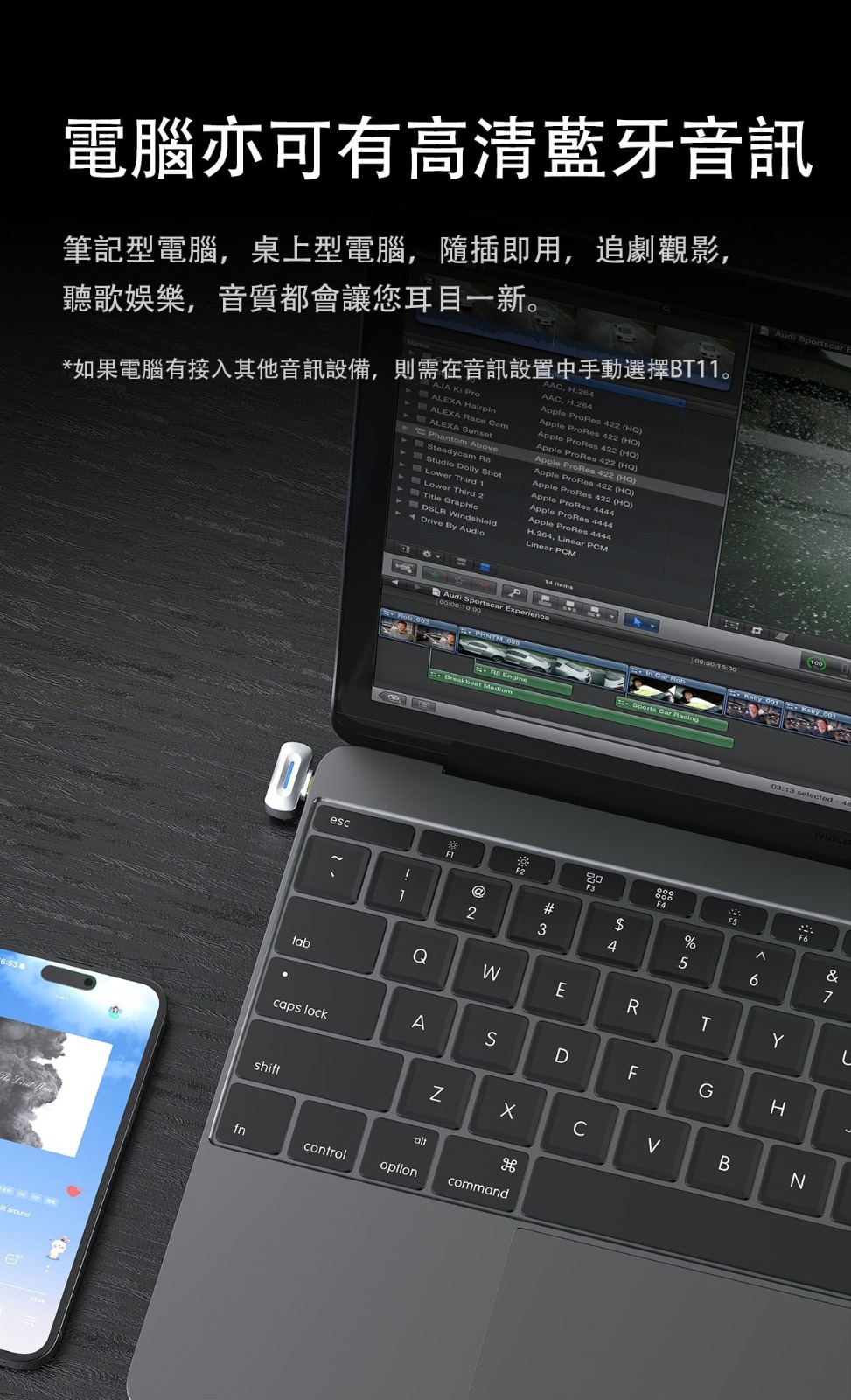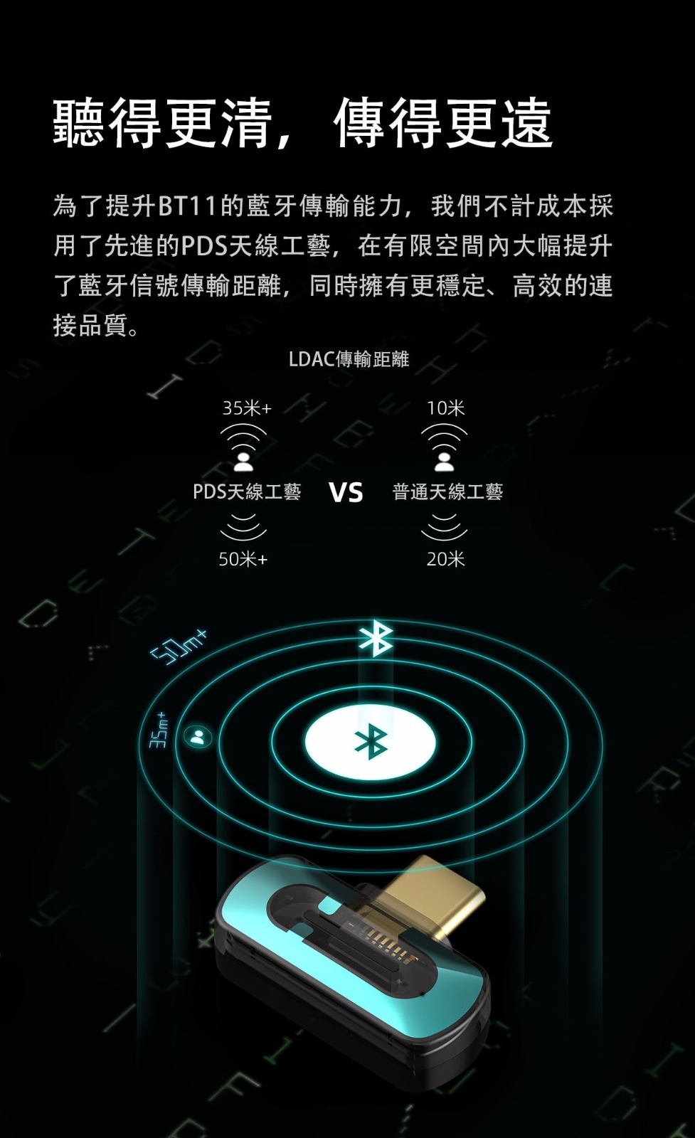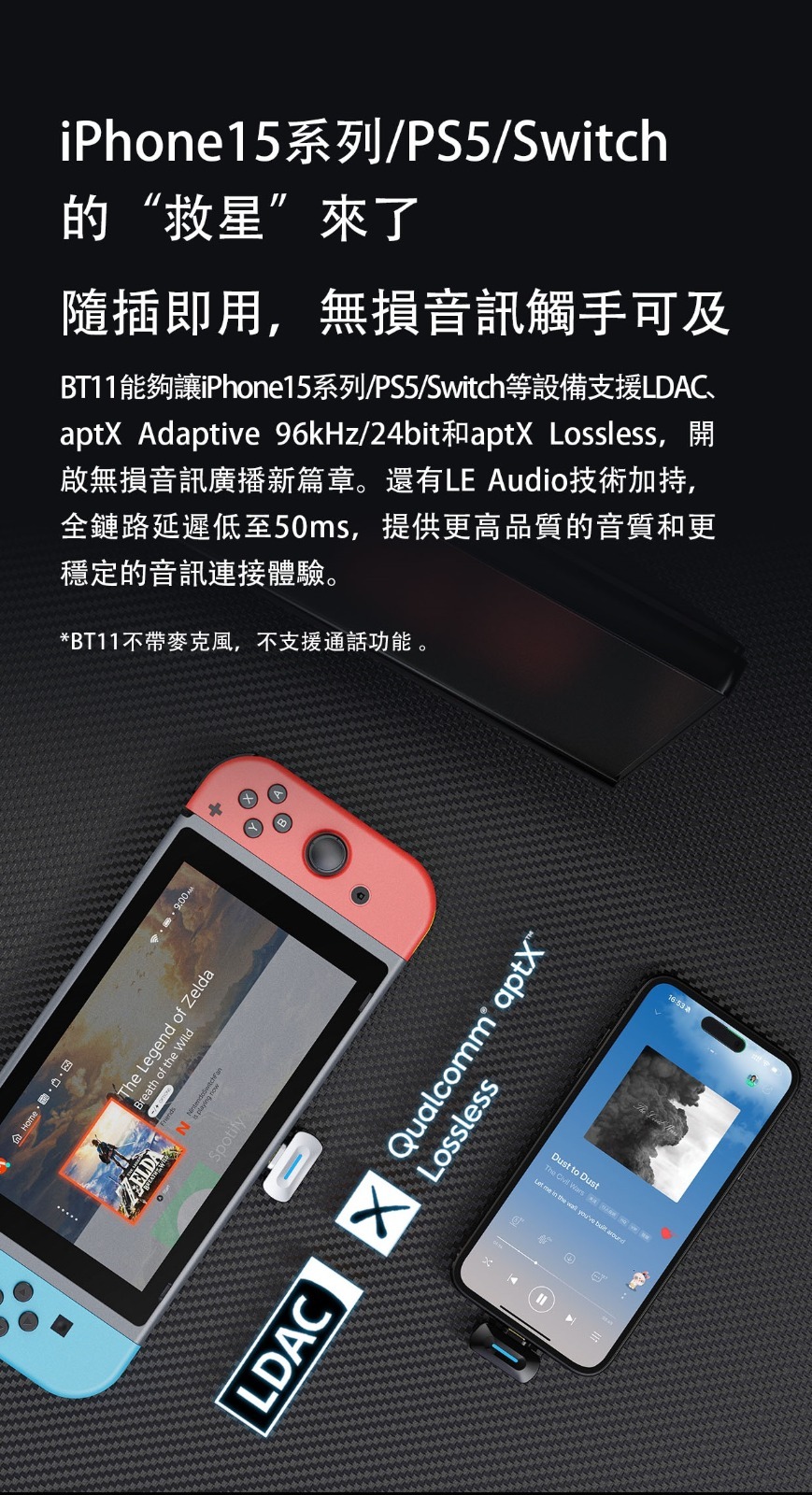 BT11能夠讓iPhone15系列/PS5/Switch等設備支援LDAC、aptX Adaptive 96kHz/24bit和aptX Lossless,開啟無損音訊廣播新篇章。還有LE Audio技術加持,全鏈路延遲低至50ms,提供更高品質的音質和更穩定的音訊連接體驗。