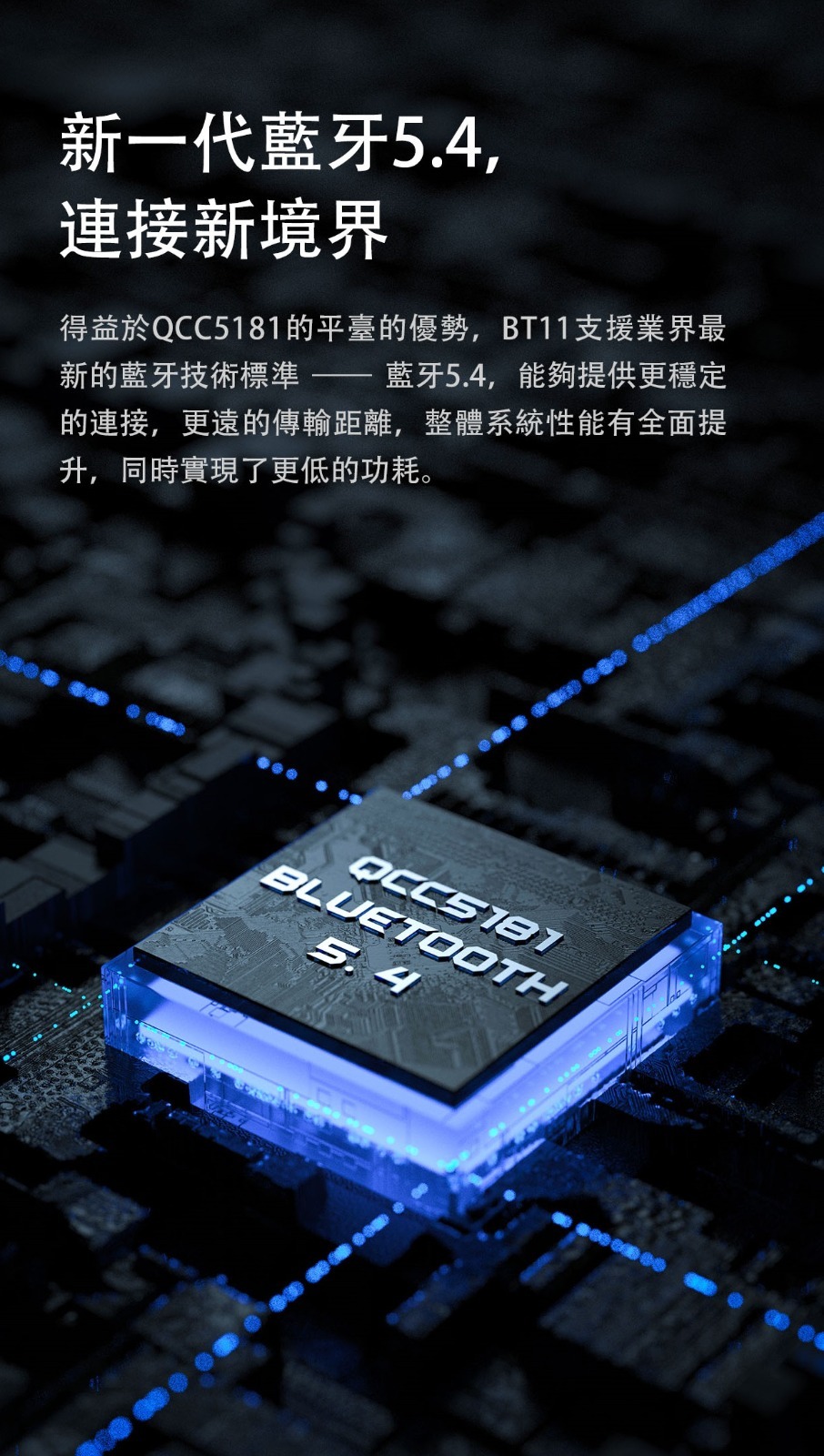 得益於QCC5181的平臺的優勢,BT11支援業界最新的藍牙技術標準 —— 藍牙5.4,能夠提供更穩定的連接,更遠的傳輸距離,整體系統性能有全面提升,同時實現了更低的功耗。