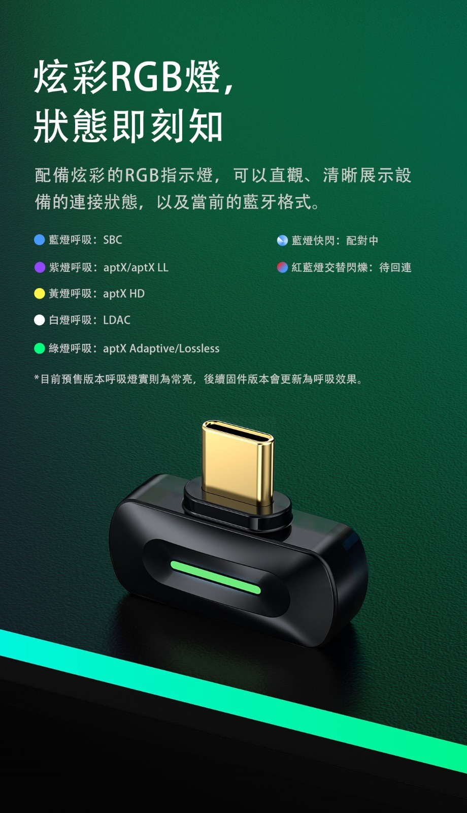 配備炫彩的RGB指示燈,可以直觀、清晰展示設備的連接狀態,以及當前的藍牙格式。
