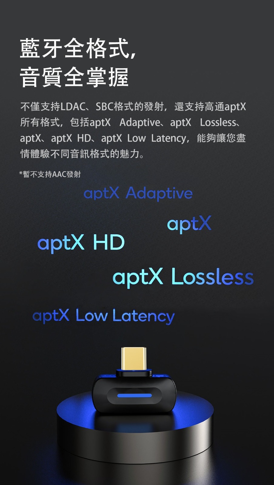 不僅支持LDAC、SBC格式的發射,還支持高通aptX所有格式,包括aptX Adaptive、aptX Lossless、aptX、aptX HD、aptX Low Latency,能夠讓您盡情體驗不同音訊格式的魅力。