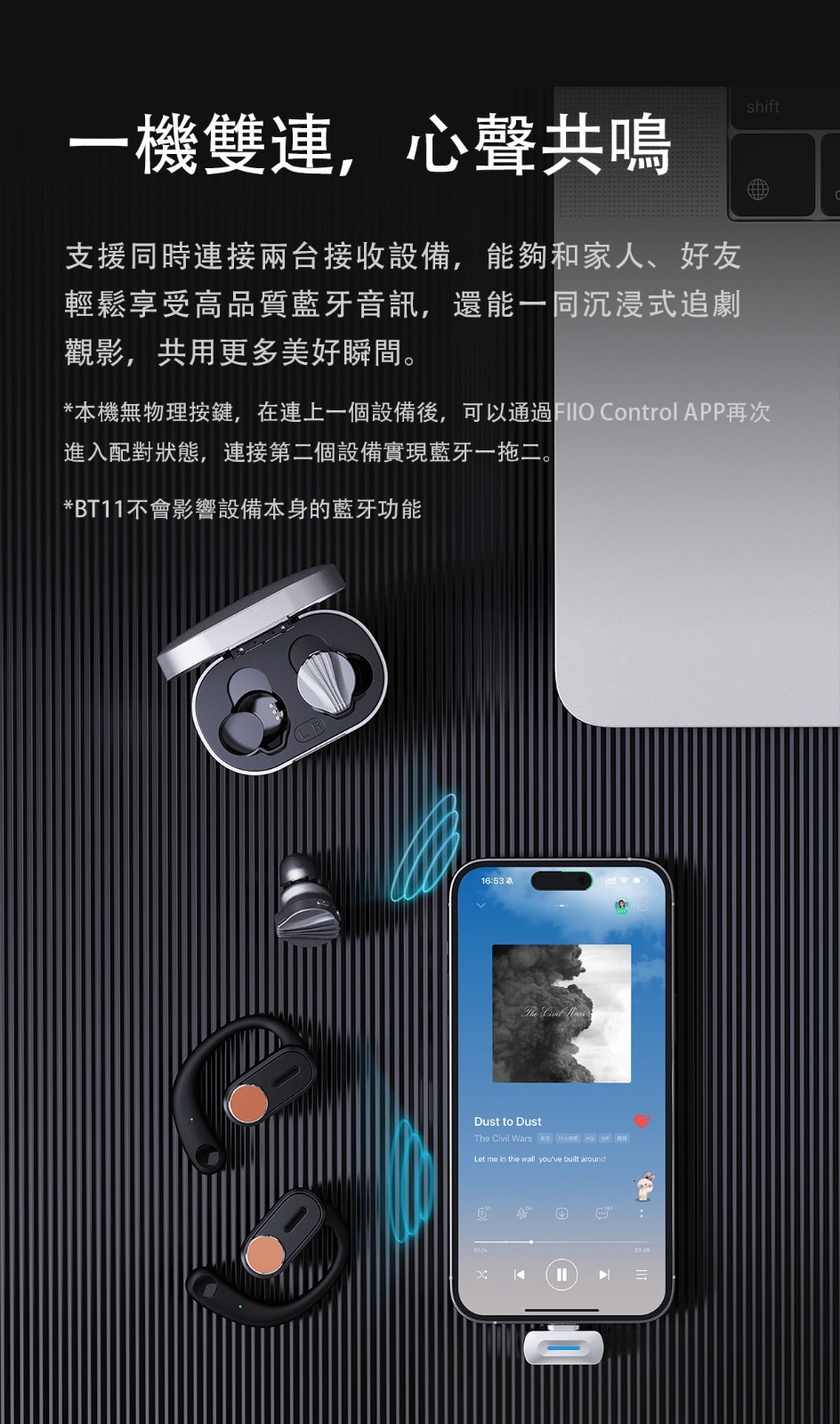 *本機無物理按鍵,在連上一個設備後,可以通過FIIO Control APP再次 進入配對狀態,連接第二個設備實現藍牙一拖二。