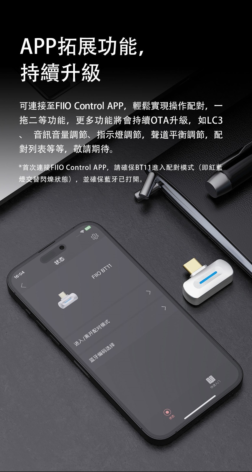 可連接至FIIO Control APP,輕鬆實現操作配對,一拖二等功能,更多功能將會持續OTA升級,如LC3、音訊音量調節、指示燈調節,聲道平衡調節,配對列表等等,敬請期待。