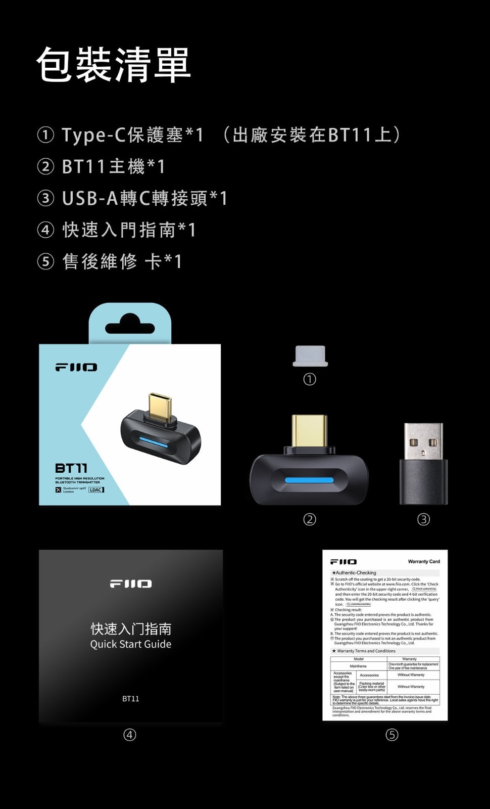 ① Type-C保護塞*1 (出廠安裝在BT11上) ② BT11主機*1 ③ USB-A轉C轉接頭*1 ④ 快速入門指南*1 ⑤ 售後維修 卡*1