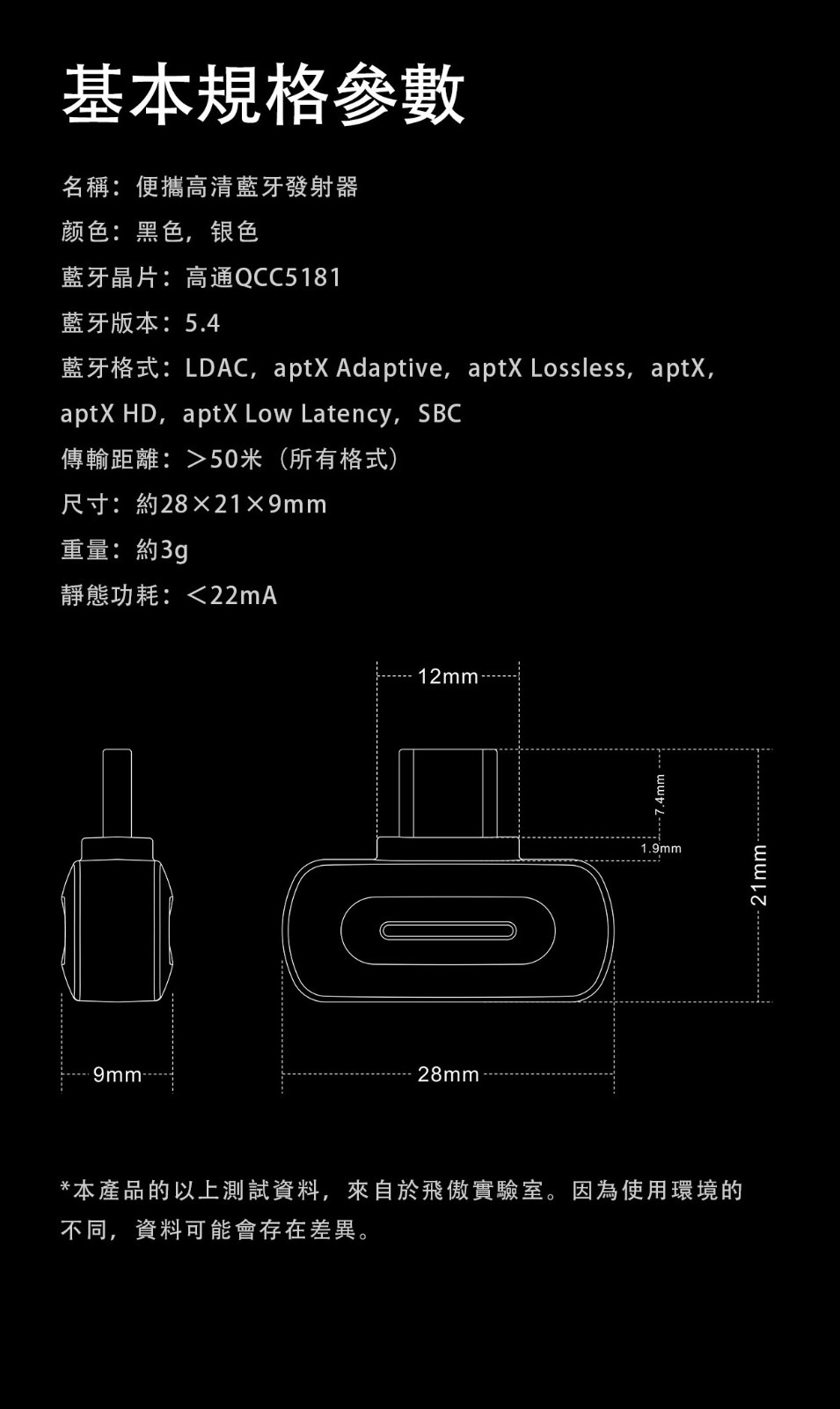 名稱:便攜高清藍牙發射器 顏色:黑色,銀色 藍牙晶片:高通QCC5181 藍牙版本:5.4 藍牙格式:LDAC,aptX Adaptive,aptX Lossless,aptX, aptX HD,aptX Low Latency,SBC 傳輸距離:>50米(所有格式) 尺寸:約28×21×9mm 重量:約3g 靜態功耗:<22mA
