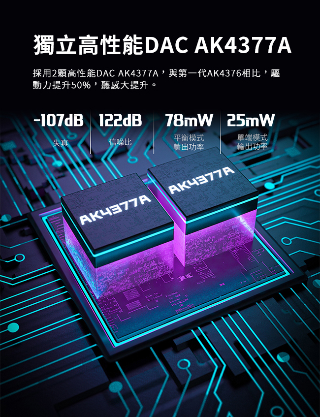 內建高性能DAC晶片AK4377A,搭配中高端耳機發揮更出色的高品質音樂。