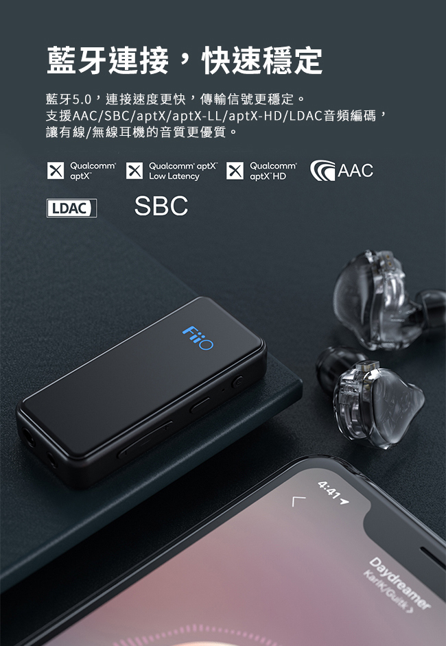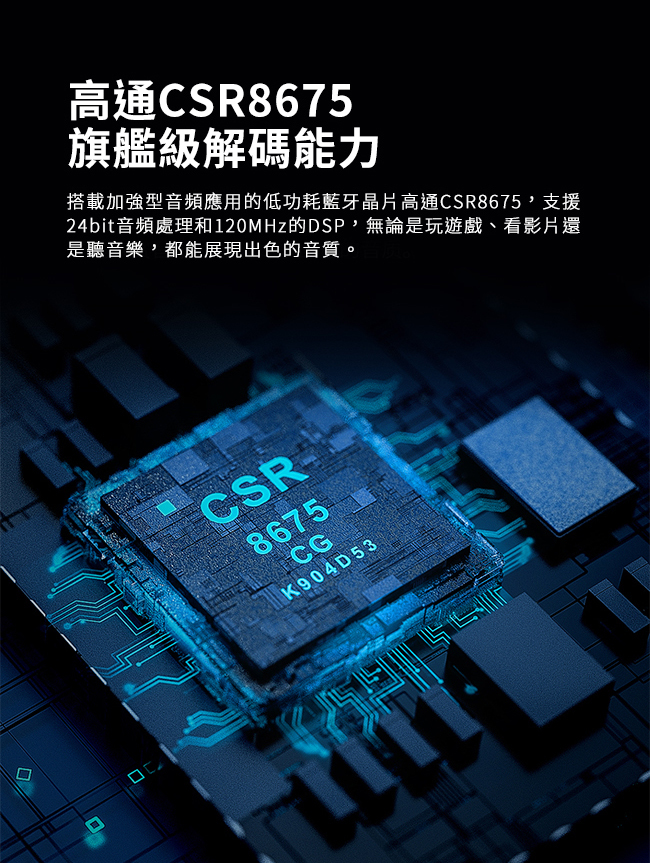 採用藍牙5.0版本CSR8675低功耗藍牙晶片,支援AAC/SBC/aptX/aptX LL/aptX HD/LDAC全格式藍牙編碼,