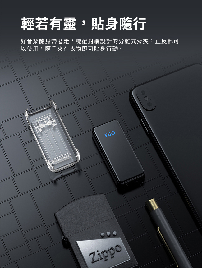 鋁合金墨黑色彩加上2.5D透明玻璃造型,標配分離式背夾,可隨時夾住衣領或口袋,貼身陪伴音樂帶著走!