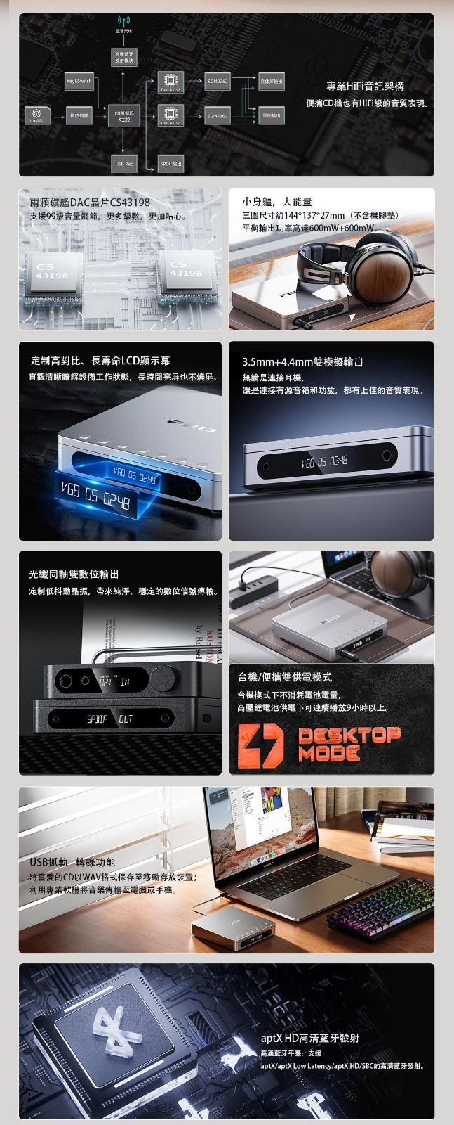 定制LCD顯示幕 | 3.5mm + 4.4mm雙類比輸出 | 光纖同軸雙數位輸出 | 台機/便攜雙供電模式 | USB抓軌 + 轉錄功能