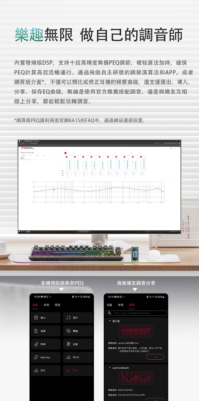 內置發燒級DSP,支持十段高精度無損PEQ調節,硬核算法加持,確保PEQ計算高效流暢運行。通過FiiO 自主研發的調節演算法和APP,或者網頁版介面*,不僅可以類比或修正耳機的頻響曲線,還支援匯出、導入、分享、保存EQ曲線,無論是使用官方推薦搭配調音,還是與燒友互相線上分享,都能輕鬆玩轉調音。