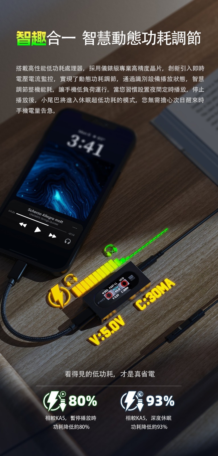 搭載高性能低功耗處理器,採用儀錶級專業高精度晶片,創新引入即時電壓電流監控,實現了動態功耗調節,通過識別設備播放狀態,智慧調節整機能耗,讓手機低負荷運行。當您習慣設置夜間定時播放,停止播放後,小尾巴將進入休眠超低功耗的模式,您無需擔心次日醒來時手機電量告急。