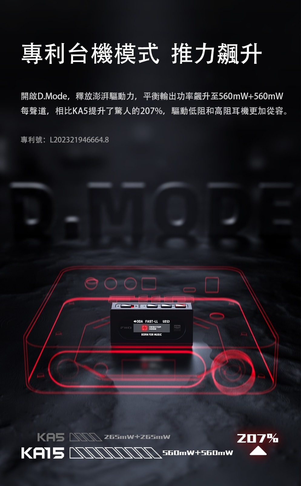 開啟D.Mode,釋放澎湃驅動力,平衡輸出功率飆升至560mW+560mW每聲道,相比KA5提升了驚人的207%,驅動低阻和高阻耳機更加從容。 專利號:L202321946664.8