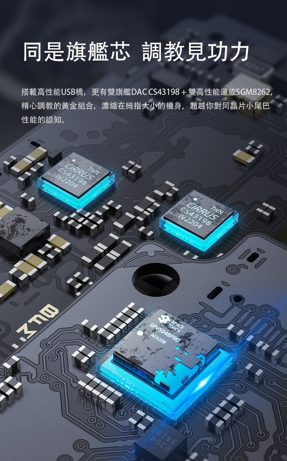 搭載高性能USB橋,更有雙旗艦DAC CS43198 + 雙高性能運放SGM8262,精心調教的黃金組合,濃縮在拇指大小的機身,超越你對同晶片小尾巴性能的認知。