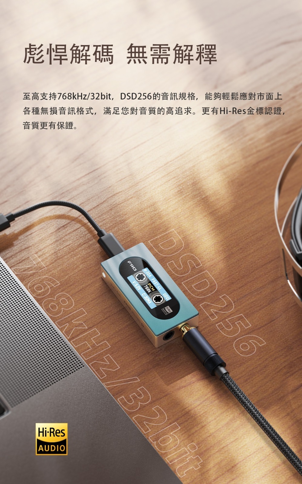 至高支持768kHz/32bit,DSD256的音訊規格,能夠輕鬆應對市面上各種無損音訊格式,滿足您對音質的高追求。更有Hi-Res金標認證,音質更有保證。