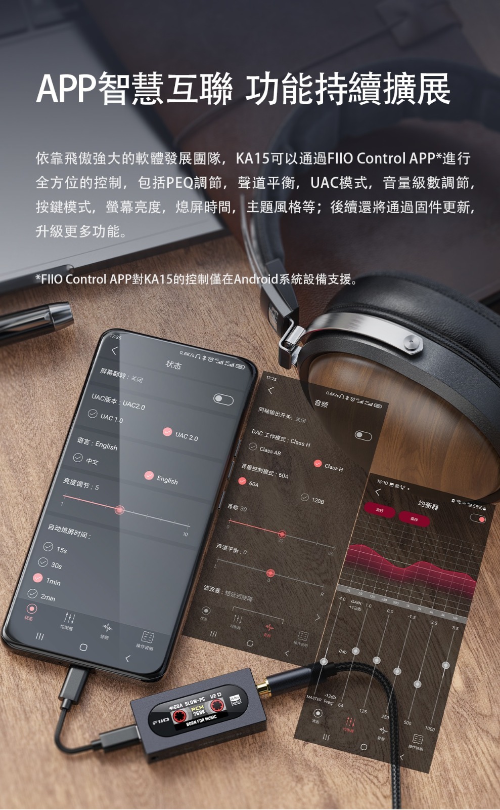 依靠FiiO 強大的軟體發展團隊,KA15可以通過FIIO Control APP*進行全方位的控制,包括PEQ調節,聲道平衡,UAC模式,音量級數調節,按鍵模式,螢幕亮度,熄屏時間,主題風格等;後續還將通過固件更新,升級更多功能。 *FIIO Control APP對KA15的控制僅在Android系統設備支援。