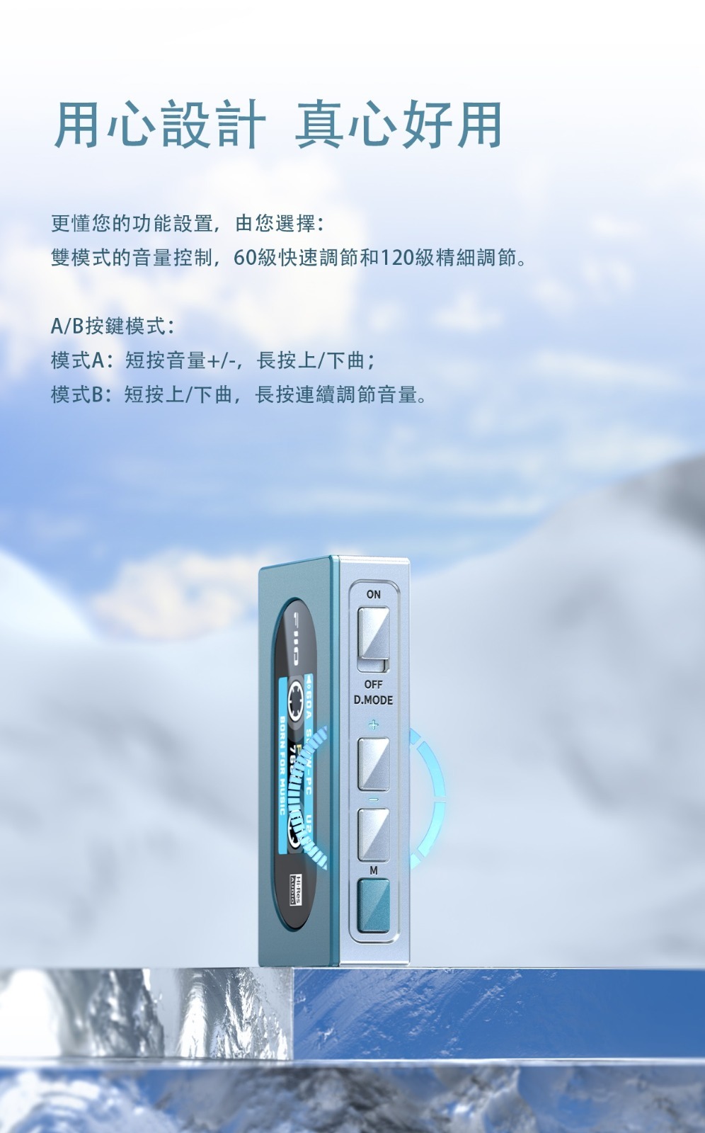 更懂您的功能設置,由您選擇: 雙模式的音量控制,60級快速調節和120級精細調節。 A/B按鍵模式: 模式A:短按音量+/-,長按上/下曲; 模式B:短按上/下曲,長按連續調節音量。