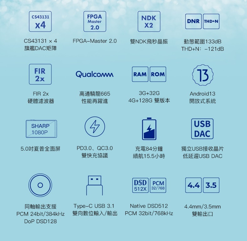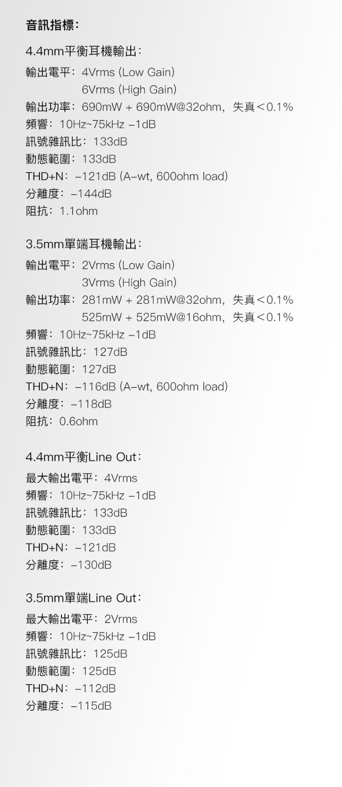 輸出:4.4mm平衡耳機輸出、3.5mm單端耳機輸出;4.4mm線性輸出;3.5mm線性輸出;3.5mm同軸輸出