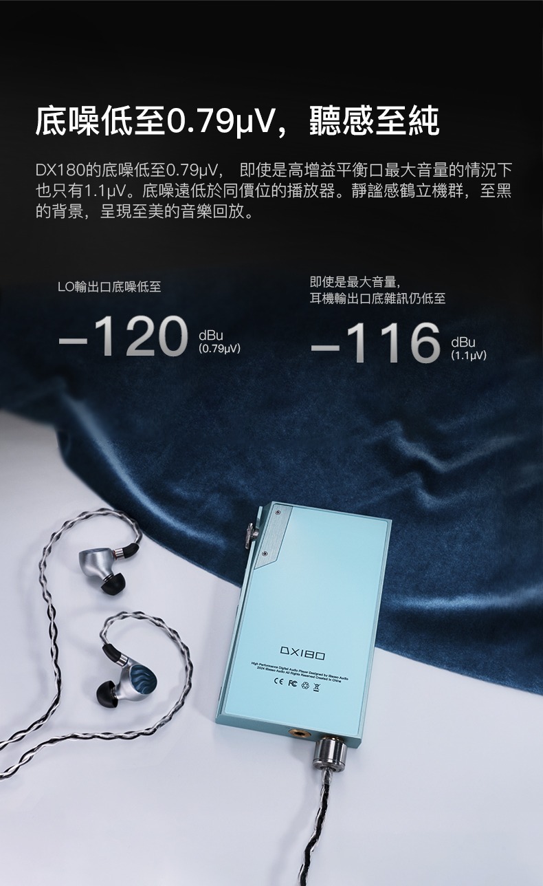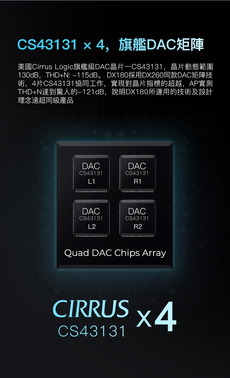 美國Cirrus Logic旗艦級DAC芯片——CS43131, 芯片動態範圍130dB,THD+N: -115dB。DX180采用DX260同款DAC矩陣技術,4片CS43131協同工作,實現對芯片指標的超越,AP實測THD+N達到驚人的-121dB,說明DX180所運用的技術及設計理念遠超同級產品。