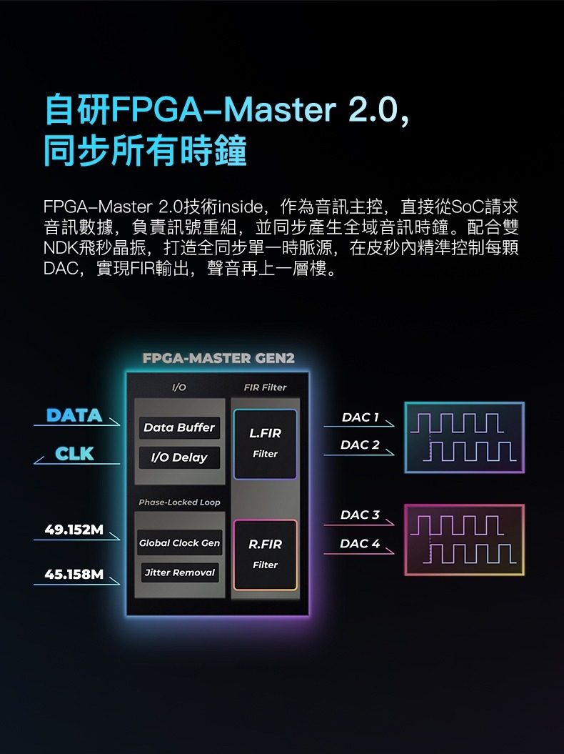 FPGA-Master 2.0技術inside,作為音頻主控,直接從SoC請求音頻數據,負責信號重組,並同步生成全局音頻時鐘。配合雙NDK飛秒晶振,打造全同步單一時鐘源,在皮秒內精準控製每顆DAC,實現FIR輸出,聲音再上一層樓。
