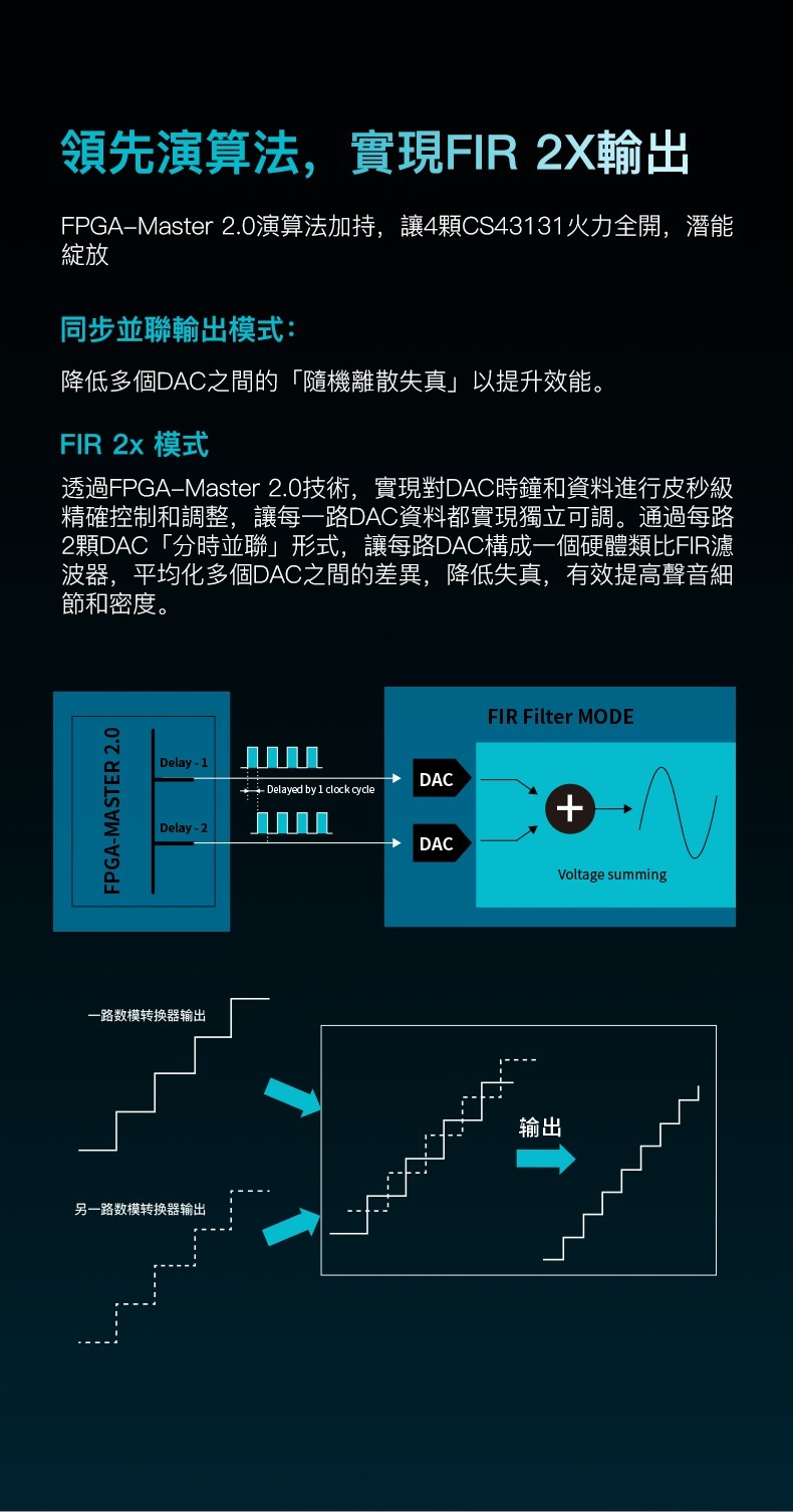 通過FPGA-Master 2.0技術,實現對DAC時鐘和數據進行皮秒級精確控製和調整,讓每一路DAC數據都實現獨立可調。通過每路2顆DAC「分時並聯」形式,讓每路DAC構成一個硬件模擬FIR濾波器,平均化多個DAC之間的差異,降低失真,有效提高聲音細節和密度。