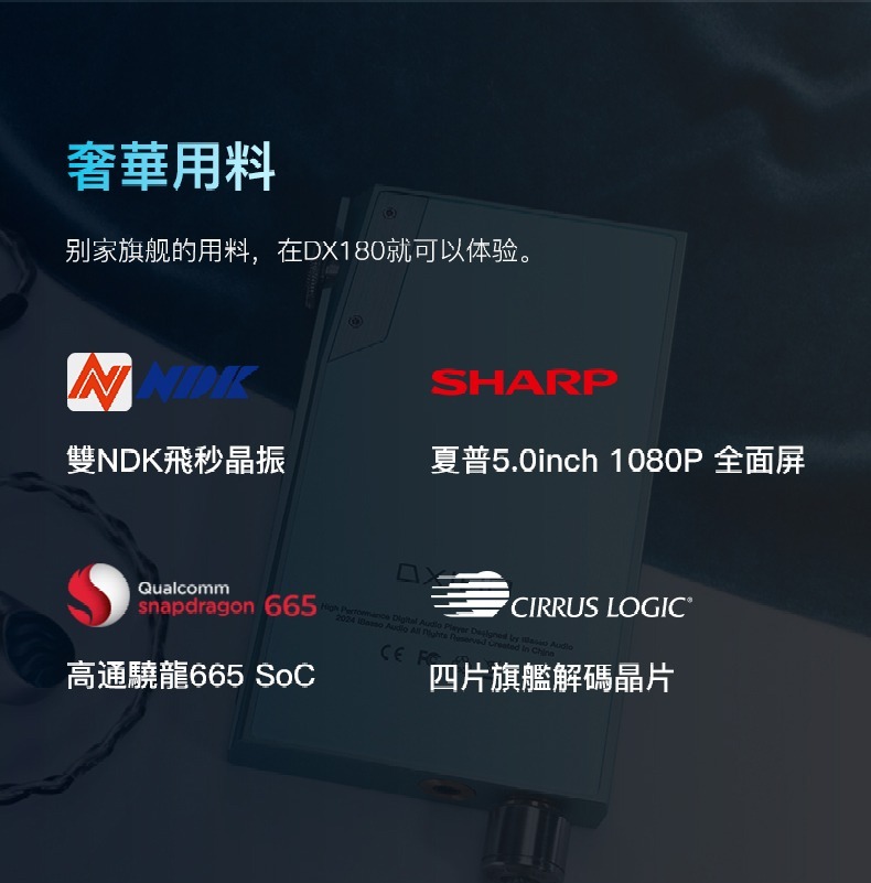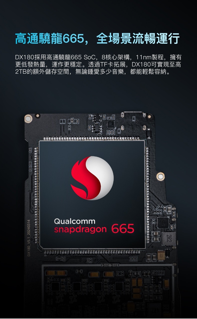 DX180采用高通驍龍665 SoC,8核心架構,11nm製程,擁有更低發熱量,運行更穩定。通過TF卡拓展,DX180可實現至高2TB的額外存儲空間,無論鐘愛多少音樂,都能輕松容納。