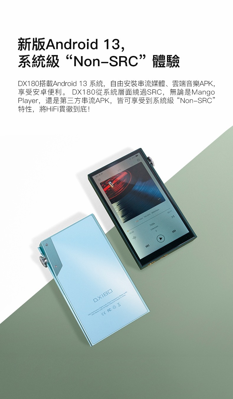 DX180搭載Android 13 系統,可自由安裝流媒體、雲音樂APK,暢享安卓便利。DX180從系統層面繞開SRC,無論是Mango Player,還是第三方流媒體APK,均可享受到系統級「Non-SRC」特性,將HiFi貫徹到底!