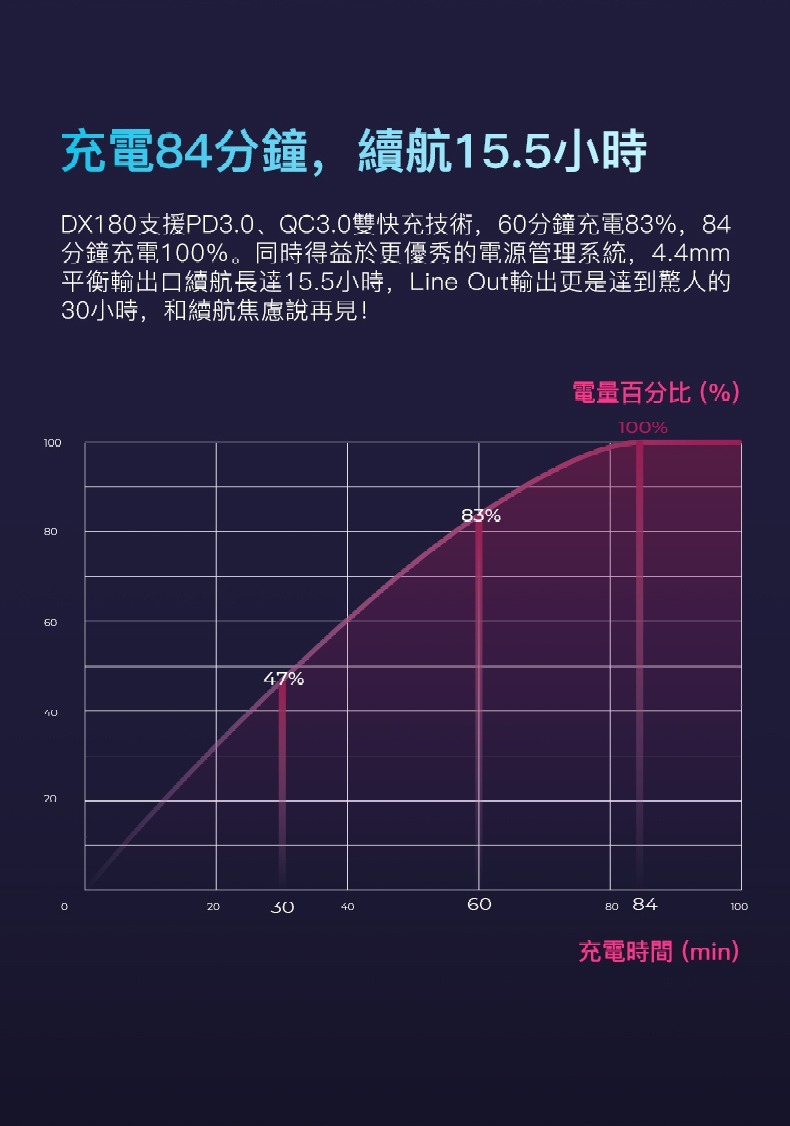 DX180支持PD3.0、QC3.0雙快充技術,60分鐘充電83%,84分鐘充電100%。同時得益於更優秀的電源管理系統,Po輸出續航長達15.5小時,Line Out輸出更是達到驚人的30小時,和續航焦慮說再見!