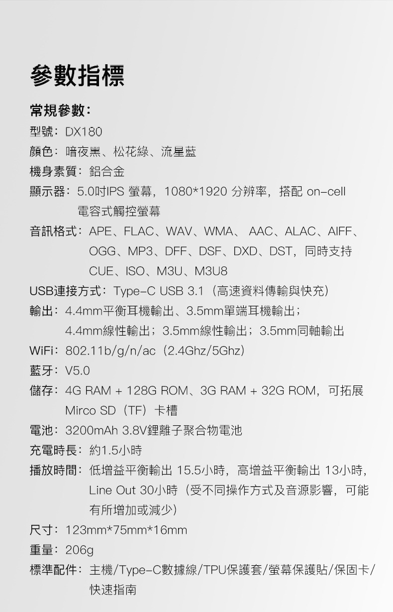 播放時長:低增益平衡輸出 15.5小時,高增益平衡輸出 13小時,Line Out 30小時(受不同操作方式及音源影響,可能有所增加或減少)